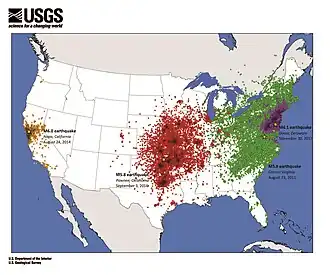 - ↑ (en) Communications and Publishing, East vs. West Coast Earthquakes. Fewer quakes but bigger stakes in the East.. United States Geological Survey (24 april 2018). Geraadpleegd op 24 september 2024 – via usgs.gov.
