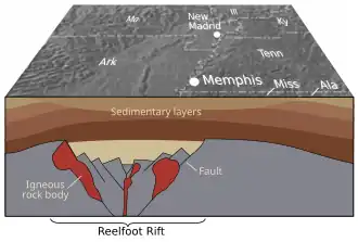 Onder het stroomgebied van de Mississippi bevindt zich hier de Reelfoot Rift, een zogenaamd aulacogen, een zwakkere plek als gevolg van het feit dat de tektonische plaat hier zowel wordt samengedrukt als uit elkaar getrokken: Meer dan 500 miljoen jaar geleden, tegen het einde van het Precambrium, werd het supercontinent Rodinia in een wilsoncyclus opengetrokken, waardoor naast Noord-Amerika's voorloper Laurentia de Iapetusoceaan ontstond.[49] Bij die tektonische beweging vormde zich als een onvolledige geologische breuk van de Noord-Amerikaanse Plaat de rift, die door dikke lagen sediment werd bedekt maar nog steeds seismisch actief is.