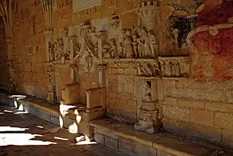 In de noordelijke galerij, aan de buitenmuur van de kerk, bevinden zich een stoel voor de abt en zitplaatsen voor de monniken. Het zijn overblijfselen van de oorspronkelijk kruisgang. Boven de stoel van de abt bevindt zich een reliëf uit de vijftiende eeuw. In het bovenste deel bevond zich een calvarie, dat echter verloren is gegaan. Links trekt een processie van monniken naar de gekruisigde, aangevoerd door de abt. Iets meer naar rechts is een treurende Maria Magdalena afgebeeld. Aan de rechterkant dobbelen Romeinse soldaten om het gewaad van Christus. Van de talrijke fresco's op de muur zijn slechts fragmenten overgebleven.