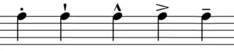 Achtereenvolgens: Staccato, Staccatissimo, Marcato, Accent, Tenuto