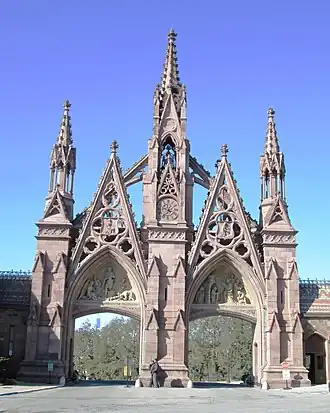 - Hoofdpoort van Green-Wood Cemetery in Brooklyn (New York). Dit is een van de zeer weinige toepassingen in niet-religieuze bouwwerken