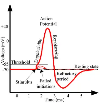 In rust is de rustpotentiaal van een neuron ongeveer -65 millivolt (mV) ten opzichte van het externe milieu. Als de membraanpotentiaal depolariseert, bijvoorbeeld doordat de geleidbaarheid voor een ion (meestal natrium) groter wordt, en vervolgens een bepaalde drempelwaarde (rond de -50 mV) bereikt, begint een opzichzelfstaand proces. Allereerst openen enkele spanningsafhankelijke natriumkanalen die in de celmembraan zitten. Natriumionen stromen de cel in en hierdoor depolariseert de membraanpotentiaal nog verder, wat het openen van meer natriumkanalen veroorzaakt. Deze positieve feedbackloop resulteert in een membraanpotentiaal wat de omkeerpotentiaal van natrium benadert (+50 mV). Natriumkanalen inactiveren uit zichzelf en daarmee neemt de geleidbaarheid voor natrium af. Vervolgens openen spanningsafhankelijke kaliumkanalen. Kaliumionen stromen de cel uit en hierdoor repolariseert de membraanpotentiaal richting de omkeerpotentiaal van kalium (-80 mV). Zodra de potentiaal weer onder de drempelwaarde komt, gaan de kaliumkanalen weer dicht, maar doordat deze kanalen iets langer open blijven staan wordt de cel te sterk gepolariseerd (ook wel hyperpolarisatie genoemd). Doordat spanningsafhankelijke natriumkanalen inactiveren en daardoor niet beschikbaar zijn voor een volgende actiepotentiaal, ontstaat een refractaire periode waarin een cel niet of verminderd in staat is om een volgende actiepotentiaal te genereren.