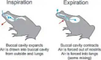 Alle amfibieën hebben als larve kieuwen, die de meeste soorten weer verliezen tijdens de metamorfose zodat ze op volwassen leeftijd over een stel longen beschikken waarmee geademd kan worden. Alle kikkers hebben longen, op één soort na; van de alleen op Borneo voorkomende soort Barbourula kalimantanensis is pas in 2008 ontdekt dat het dier geen longen heeft en als enige kikker uitsluitend door de huid ademt. De meeste kikkers en padden kunnen ook zuurstof door de huid opnemen, zo kunnen ze in de winter, ingegraven in modder, maanden onder water blijven en ook soorten die sterk op een leven in water zijn aangepast hebben hier voordeel bij. De klauwkikker (Xenopus laevis) heeft een specialisatie bestaande uit een rij zuurstofopnemende cellen aan iedere flank, die eruitziet als een hechting.