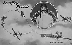 (En Pégoud gaat naar boven / om zijn kunsten te vertonen / eerst op zijn rug / en dan op zijn buik / en zo vliegt hij de piste uit)