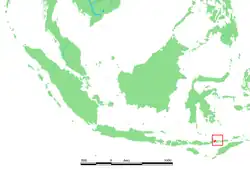 | Adonara vanuit de ruimte tijdens een uitbarsting van de vulkaan Iliboleng | |