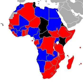 ![]() ■ Gastland (■) ■ Gekwalificeerd ■ Uitgeschakeld ■ Neemt niet deel (wel lid) ■ Geen lid |