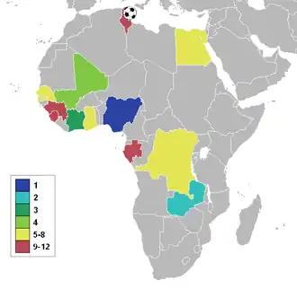- ↑ Inclusief drie deelnames als Congo-Kinshasa.