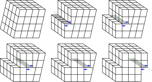 Door een extern aangebrachte spanning, door kracht, glijden delen van de kristalstructuur langs elkaar. Daarmee verandert de geometrie van het materiaal. Afhankelijk van het type kristalrooster bevinden zich verschillende kristalvlakken in het materiaal, waarlangs het voor de atomen energetisch gunstig is om langs elkaar te glijden. De afbeelding hiernaast toont een schematische weergave van wat er bij afschuiving gebeurt. Hoewel het afgebeelde materiaal van vorm verandert, de staaf wordt langer en dunner, blijft de structuur van het materiaal min of meer hetzelfde.