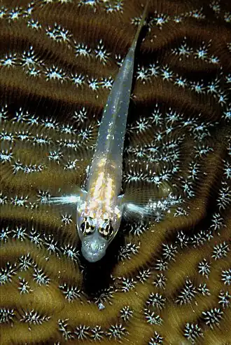 | Coryphopterus glaucofraenum (grondel soort) rust uit op een bedje van Agaricia grahamae | |||||||||||||