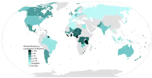 De ahmadiyya zijn voornamelijk te vinden in Pakistan, India, Bangladesh, Indonesië en West-Afrika maar ook in Europa, Amerika, Zuid-Amerika, Azië en Australië[23][24][25][26]. Volgens een verklaring van de Ahmadiyya Moslim Gemeenschap, zijn er wereldwijd 10 miljoen Ahmadi's.[27][28][29] [30] [31]