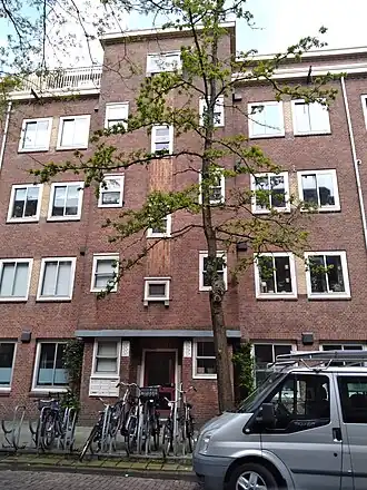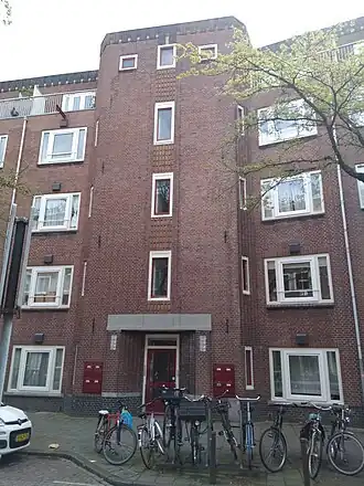 De bebouwing aan de straat bestaat uit twee bouwblokken, die allebei gebouwd werden door het Woningbedrijf Amsterdam: