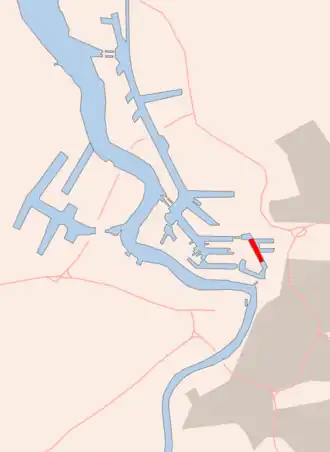 Voorbij hoek nummer 130 is de ingang van het Tweede Havendok, met aan de Albertdokzijde gelegen nummering 154 en 156 van de Potass d'Alsace-concessie. Nog verder ligt de ingang van het Derde Havendok.