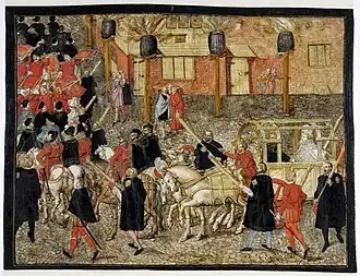 Op 11 november 1565 maakt Maria van Portugal bij valavond haar intrede in Brussel. Haar fraaie koets wordt gemend door de ontwerper ervan, Francesco de Marchi. De hoogste landsadel en de vertegenwoordigers van de vier grote steden van Brabant zijn haar buiten de stadspoort tegemoet gekomen. Ook de heren van de wet en de wapengilden zijn erbij. Haar stoet, bestaande uit voetsoldaten en vliesridders te paard, volgt een parcours dat wordt verlicht door brandende pektonnen op staken. 296 x 388 mm Inv. 10249 |