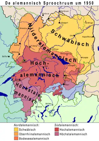 Naast deze puur linguïstische opdeling kunnen de Alemannische dialecten als volgt op grond van hun geografische spreiding worden opgedeeld: