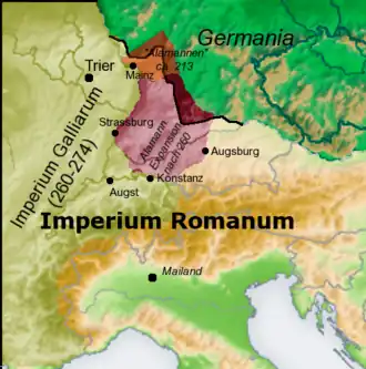Aan het einde van de groei van het Romeinse Rijk was het Romeinse Rijk ineengekrompen tot alleen Italië en vormden de Alpen de grens tussen het Romeinse Rijk en Allemannië. De Romeinen sloten in 328 een verdrag met de Alemannen. De Allemannische krijgers werden in het leger genomen door de Romeinen. In 350 kwam het Romeinse leger in opstand en het verdrag werd verbroken. Deze twee volkeren bleven tot de val van het West-Romeinse Rijk vijanden van elkaar.