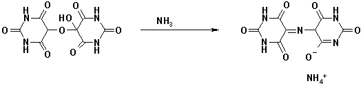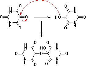 Alloxaan (links) met dialurinezuur (rechts) en alloxantine (midden).