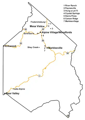- ↑ Kirkwood ligt op de grens met Amador County en telt in totaal 158 inwoners. Daarvan wonen er 97 in Alpine County.
