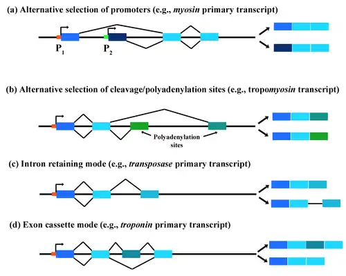 - Alternatieve selectie van promotors: dit is de enige splicingmethode dat een alternatief N-terminus domein in proteïnen kan vormen. In dit geval kunnen verschillende sets van promoters splicen met bepaalde sets van andere exons.