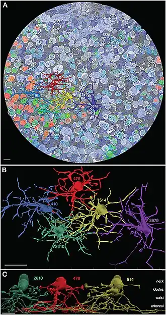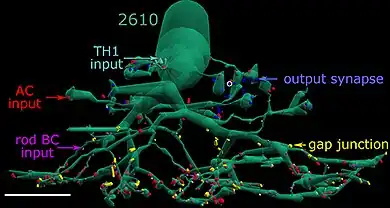 - ↑ a b c Marc, R. E., Anderson, J. R., Jones, B. W., Sigulinsky, C. L., Lauritzen, J. S. (2014). The AII amacrine cell connectome: A dense network hub. Frontiers in Neural Circuits 8: 104. PMID 25237297. PMC 4154443. DOI: 10.3389/fncir.2014.00104.
