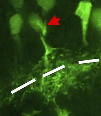 - Onderschept retinale ganglioncellen en/of bipolaire cellen in de binnenste plexiforme laag[2]