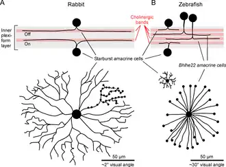 - ↑ (en) Taylor, W. R., Smith, R. G. (January 2012). The role of starburst amacrine cells in visual signal processing. Visual Neuroscience 29 (1): 73–81. ISSN: 1469-8714. PMID 22310373. PMC 3292856. DOI: 10.1017/S0952523811000393.