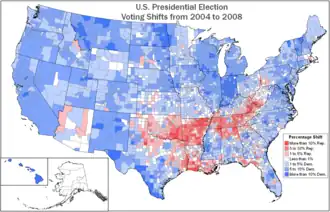 Gedurende de verkiezingsstrijd in 2008 werden ook deze staten zwaar bevochten, alsmede Pennsylvania en Ohio. Echter ook een aantal staten die Bush met gemak won in 2004 waren in 2008 binnen het bereik van Obama, met name Colorado, Virginia, Indiana, Missouri en North Carolina. Toen gedurende de avond van de verkiezingen de uitslagen van de genoemde staten, op Missouri na, allemaal ten gunste van Obama uitvielen, werd het duidelijk dat hij de verkiezingen ging winnen. In de dagen na de verkiezingen werd bekendgemaakt, dat Obama ook Indiana en North Carolina gewonnen had.