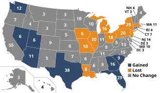 Er was een wijziging ten opzichte van de vorige verkiezingen in de verdeling van kiesmannen over de staten. Deze verdeling was gebaseerd op de volkstelling van 2010.[3] Acht staten (Arizona, Florida, Georgia, Nevada, South Carolina, Texas, Utah en Washington) kregen meer kiesmannen toegewezen. Tien staten (Illinois, Iowa, Louisiana, Massachusetts, Michigan, Missouri, New Jersey, New York, Ohio en Pennsylvania) zagen hun aantal kiesmannen afnemen.