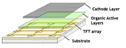 Een amoled-scherm bestaat uit oled-pixels die verwerkt zijn in een thin-film transistor (tft). De pixels kunnen geïntegreerd zijn in de dunne laag (thin film) van de tft of hierop geplaatst zijn. De pixels zijn zo gerangschikt dat ze een raster van pixels vormen. Tussen de tft-laag en de kathodelaag is er een laag met organisch materiaal dat oplicht als er een elektrische activering plaatsvindt. Om te bepalen hoe helder een bepaalde pixel moet oplichten, wordt er een controle uitgevoerd door twee tft's. Eén controleert het starten en stoppen van het laden van een condensator. De tweede dient om een spanningsbron op niveau te houden die nodig is om een constante elektrische stroom te leveren voor de pixel.
