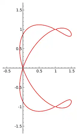 Het is een kromme met genus 0. De kromme snijdt zichzelf drie keer. De coördinaten van de snijpunten zijn en .