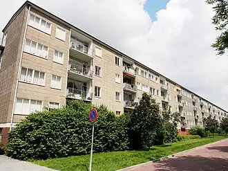 - 192 woningen in acht noord-zuid gerichte portiekflats van drie woonlagen en