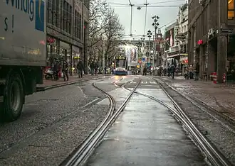 Door de straat rijdt tramlijn 14. Van 1903-2018 reed ook tramlijn 9 door de straat. Tot 1985 werd alleen staduitwaarts door de Amstelstraat gereden. Stadinwaarts werd langs de Amstel gereden. Sinds 1985 wordt in beide richtingen door de Amstelstraat gereden. In de Amstelstraat ligt voor enige lengte het spoor in de vorm van een strengelspoor. Dit had te maken met ladende en lossende vrachtauto's bij het voormalige bankgebouw van ABN-AMRO. Daar had men bezwaar tegen dubbelspoor om die reden. Ook na vertrek van deze grootbank is dat zo gebleven. De kosten van zo'n anderhalf miljoen euro om er dubbelspoor van te maken wogen niet op tegen de vermoede tijdwinst.