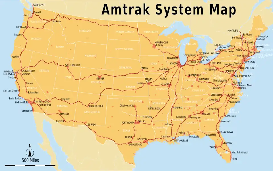| Trajecten | 44 routes in de aaneengesloten Verenigde Staten (met uitzondering van Wyoming en South Dakota) en drie bestemmingen in Canada (Vancouver, Toronto en Montreal) | |||