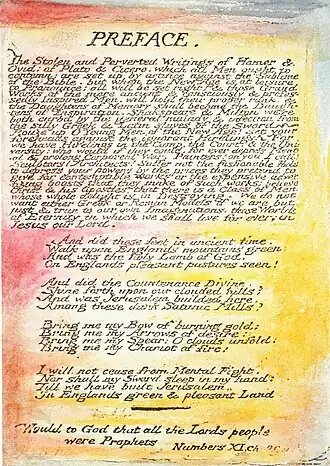 Het gedicht was in de 19e eeuw niet erg bekend, maar het werd in 1916 in een patriottische bloemlezing van gedichten gepubliceerd. Dit was een tijd waarin het moreel van het volk laag was vanwege het hoge aantal slachtoffers van de Eerste Wereldoorlog. Charles Hubert Parry maakte er vervolgens een toonzetting bij, dat later bekend zou worden als Jerusalem. Toen Koning George V dat lied voor het eerst hoorde, door eenstemmige koorzang en orkestbegeleiding van Edward Elgar, heeft hij vermoedelijk gezegd dat dit het nationale volkslied moest worden in plaats van God save the King.