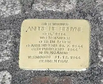 Op 7 maart 2019 werd door de Nationale Confederatie van Politieke Gevangenen en Rechthebbenden van België, gewest Gent-Eeklo een herinneringssteen geplaatst ter nagedachtenis van André De Bruyne voor het huis waar hij samen met zijn ouders woonde en waar hij in 1943 bijna werd aangehouden. Dezelfde dag werden gedenkstenen geplaatst ter nagedachtenis van Michel Cloquet (Gent, Kortrijksesteenweg 890), Frans en Lucien Van Speybroeck (Zwijnaarde, Dorpsstraat 34), Carlos en Charles Goubau (Drongen, Goubaulaan 3), en de twee andere weerstanders van Mariakerke: verzekeraar Gérard Willemot (Mariakerke, Gérard Willemotlaan 90) en schepen Henri Story (Mariakerke, Henri Storystraat 2).