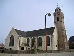 Oorspronkelijk (1480 en later) stond de kerk in het centrum, maar doordat de zee met name tijdens de Allerheiligenvloed van 1570 huizen ten westen van de kerk wegspoelde, staat het gebouw nu aan de kust tegen de boulevard aan. Het is daarmee de enige kerk in Nederland die pal aan zee ligt.