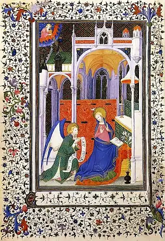- ↑ De Gebroeders Van Limburg in de Très Riches Heures du duc de Berry, Meester van de Harvard Hannibal, getijdenboek Ms. W.287, The Walters Art Gallery, Baltimore, Jacqemart de Hesdin in de Petites heures du Duc de Berry en de Bedford-meester in de De Lévis-getijden (Beinecke Library, New Haven, Connecticut, Ms. 400.