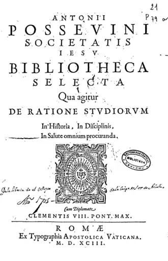 - ↑ Luigi Balsamo, Antonio Possevino, Bibliografo della Controriforma (Florence, 2006)