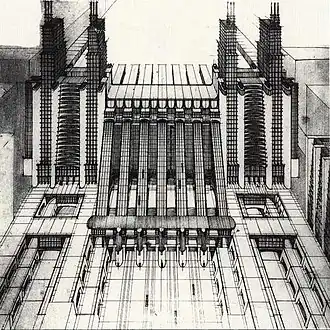 Antonio Sant'Elia studeerde aan de technische school te Como. Hij was mede betrokken bij de oprichting van de groep Nuove Tendenze. Op de eerste tentoonstelling van deze groep in 1914 toonde hij zijn ontwerpen voor een futuristische stad, zijn 'Citta Nuova'. Bij deze ontwerpen schreef hij de tekst 'Messagio' waarin hij verduidelijkt op welke wijze een stad in de toekomst geconstrueerd dient te worden. In deze tekst pleit hij ervoor de vormen van het verleden achterwege te laten en voor de moderne stedenbouw nieuwe vormen te ontwikkelen die zich baseren op de verworvenheden van de wetenschap.