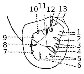 - De palatale zijde: de vrije buitenste schelpwand van de laatste winding, ook wel peristoom genoemd (A-D-C). Hierbij wordt soms ook nog onderscheid gemaakt tussen het basale gedeelte (C-D) en de palatale zijde in strikte zin (A-D).