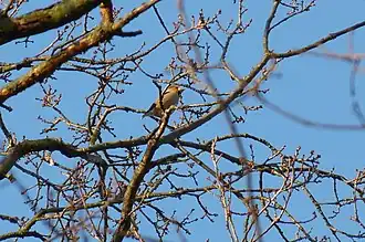De appelvink is een schuwe vogel die zich meestal hoog in de bomen ophoudt.