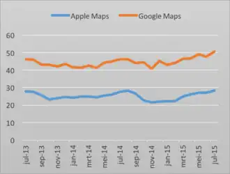 - ↑ (en) Rogerson, J., Apple Maps surging back in fight against Google. TechRadar (12 augustus 2014). Gearchiveerd op 7 september 2015. Geraadpleegd op 22 oktober 2015.
