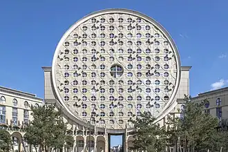 De twee karakteristieke elementen van het geheel zijn twee cilindervormige gebouwen (bijgenaamd de "camemberts" door de bewoners), geplaatst boven de west- en oostzijde van het plein.