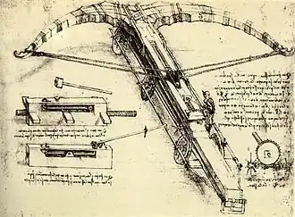 Leonardo da Vinci beschreef in zijn Codex Atlanticus een gigantische arcuballista met composietboog.[1] Deze zogenoemde "ballista" werd gespannen middels een wormwiel en stond op licht gekantelde wielen, waardoor deze stabieler stond.[2]