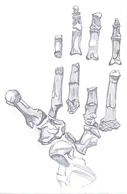De vingerkootjes van A. ramidus zijn langer dan bij de moderne mens maar de middenhandsbeenderen zijn juist korter. Moderne basale mensapen kregen een langere middenhand om torsie bij het klimmen en slingeren te weerstaan. Het eerste middenhandsbeen van A. ramidus is echter juist relatief langer en robuuster. Dat zou een aanwijzing kunnen zijn dat speciale hoxgenen de bouw van de binnenste middenhand reguleerden. Overeenkomstig is de duim robuuster. Dit zou bij Homo nog sterker worden maar de robuustheid ten opzichte van gorilla's en chimpansees is ten dele van oudere apen geërfd. De verbinding tussen middenhand en pols lijkt op die van mensapen uit het Mioceen: bij de kop van de middenhandsbeenderen wordt de bovenkant aan beide zijden diep ingesneden voor de bevestiging van het gewrichtskapsel. Dat stelde de hand in staat zich verder te strekken en plat op de grond het gewicht te dragen voor een afzet.[9]