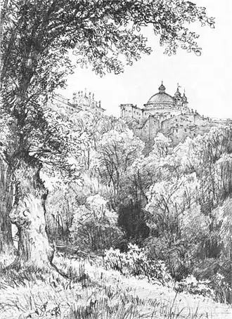 Ariccia is een kleine stad nabij Rome, gelegen aan de Via Appia, tussen de meren van Albano en Nemi, deel uitmakend van de Castelli Romani. Haar belangrijkste architectonische handelsmerken dateren echter uit de zeventiende eeuw: de imposante barokke kathedraal Collegiata di Santa Maria Assunta en het Palazzo Cigi, beide ontworpen door Gian Lorenzo Bernini. Een bezoek aan Ariccia maakte in de negentiende eeuw deel uit van de zogenaamde "grande tour" die veel aristocraten uit Rusland en later de Verenigde Staten toentertijd door Zuid-Europa maakten. Ook veel schilders bezochten het plaatsje, dat rond 1835 amper 1000 inwoners telde. Lebedev bezocht het stadje in 1835 met een beurs van de Russische Academie voor Beeldende Kunsten, minder dan twee jaar voor zijn dood op 26-jarige leeftijd. Voor een noorderling, gewend aan mistige grijstonen en schrale landschappen, vormden de weelderige natuur van Italië, haar prachtige architectuur en de gewone mensen in heldere felgekleurde kleren, een hele nieuwe wereld. Lebedev raakte er klaarblijkelijk niet op uitgekeken. Het hier besproken werk is het eerste van meerdere nagenoeg identieke versies die hij van hetzelfde uitzicht maakte. Ook zijn enkele eerdere, ter plekke gemaakte studies bekend.