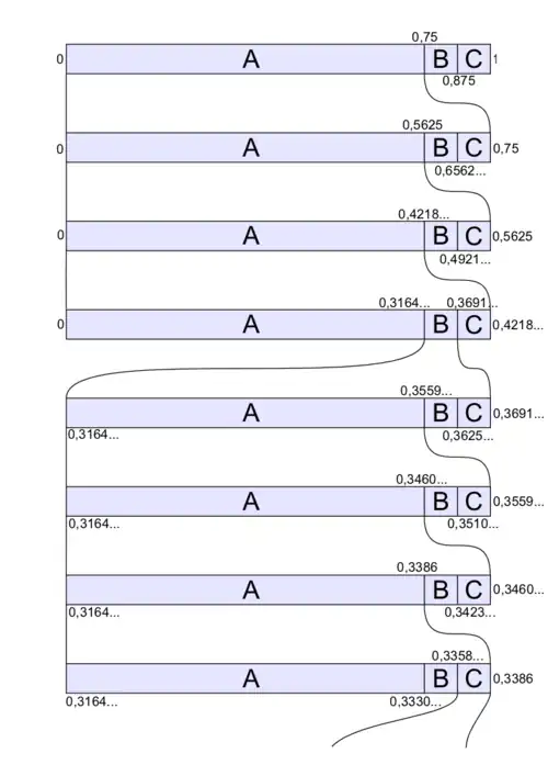 - [0; 0,75] wordt wederom in nieuwe subintervallen verdeeld.