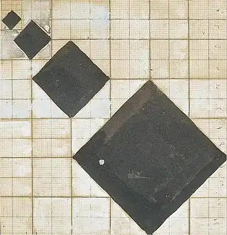 Het werk kwam tot stand van 1929 tot begin 1930. Het is het op een na laatste schilderij van Van Doesburg (zijn laatste schilderij, uit 1930, Simultane contra-compositie, bevindt zich in het Museum of Modern Art in New York). De compositie is gebaseerd op een raster van 144 vierkantjes, wat goed te zien is op een voorstudie van het werk, dat zich in het Kröller-Müller Museum bevindt. Het beeldvlak is verdeeld in witte en grijze vlakken in een verhouding van 3 : 6 : 12 : 24. Over deze vlakken zijn diagonaal vier zwarte vierkanten geplaatst, waarvan de oppervlakte steeds met een viervoud vermenigvuldigd wordt.[1] Het schilderij is ontstaan naar aanleiding van het werk Zes momenten in de ontwikkeling van vlak naar ruimte (zie hieronder). Het zou kunnen dat Van Doesburg een serie van dit soort rasterschilderijen heeft willen maken.[2]