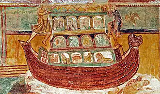 - De Ark van Noach. De ark van Noach is een van de bekendste taferelen. De ark drijft in een met lijken bedekte zee. Er is een raaf vrijgelaten om te zien of de aarde al opdroogt. Het dak van de ark is open, zodat de inzittenden van boord kunnen gaan.