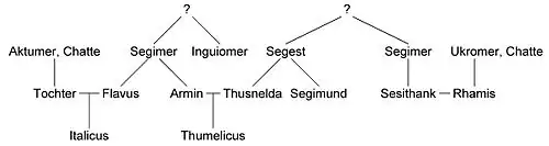 - ↑ Reinhard Wolters: Die Schlacht im Teutoburger Wald. Arminius, Varus und das römische Germanien. Beck, München 2008, blz. 97. vergelijk ook: Peter Kehne: Der historische Arminius und die Varusschlacht aus cheruskischer Perspektive in: '2000 Jahre Varusslacht: Mythos. Uitgegeven door het Landesverband Lippe, Stuttgart 2009, blz. 104-113, hier: blz. 105