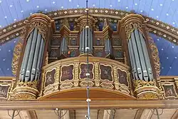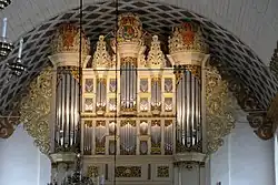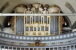 Beeltenis van Schnitger (midden) op het orgel in de kerk van Golzwarden
